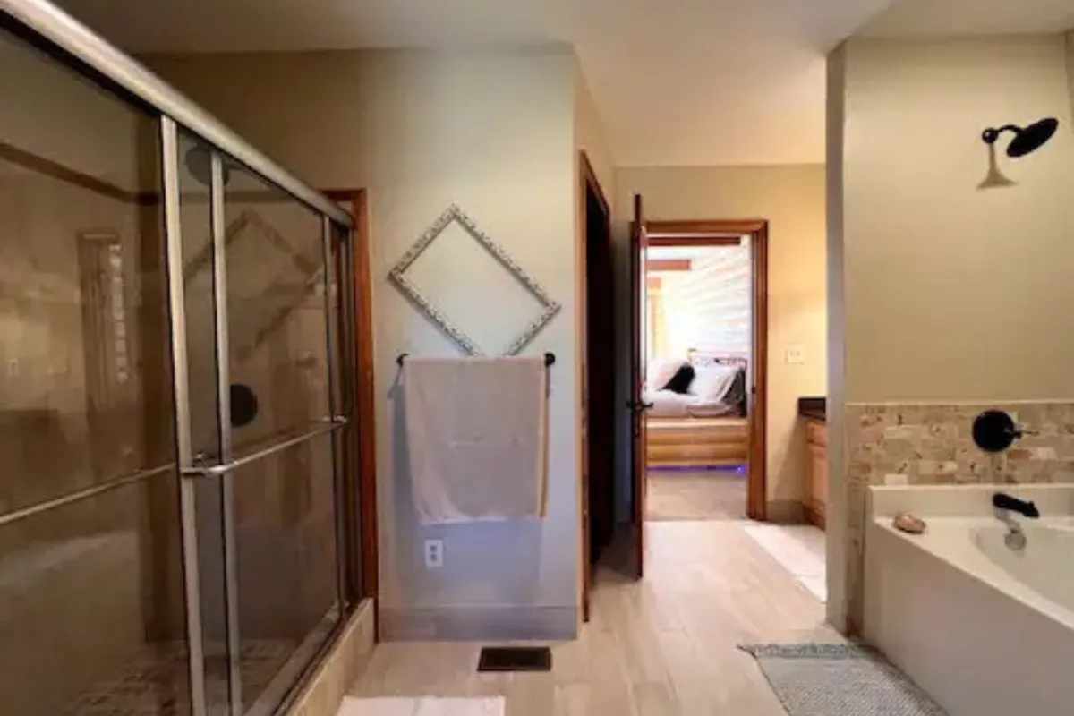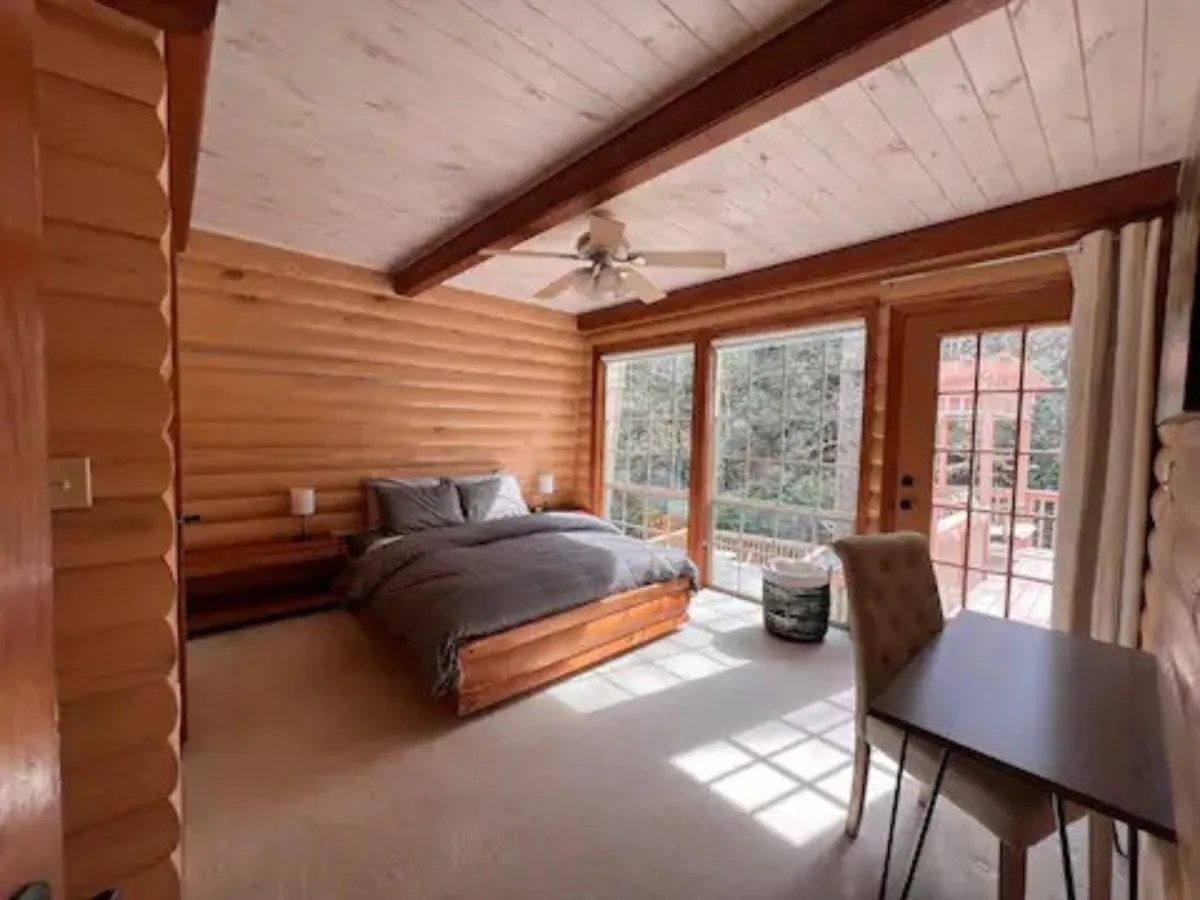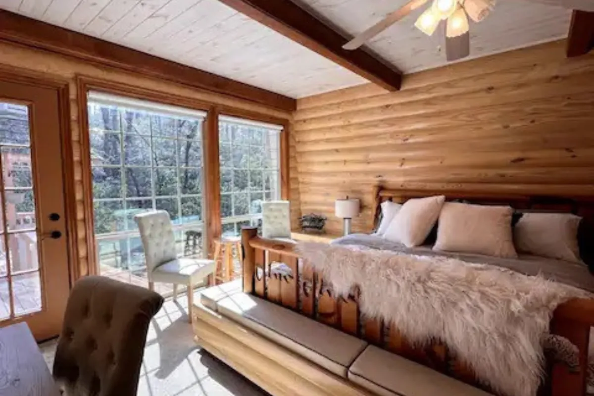 Experience cozy lodging that seamlessly blends comfort with rustic elegance. Featuring warm wood accents, this inviting space includes a plush couch and chair for relaxation, a charming bedroom for a restful night, and a distinctive fireplace that adds warmth and ambiance. This serene retreat offers the perfect setting to unwind and soak in the natural beauty of the surroundings.